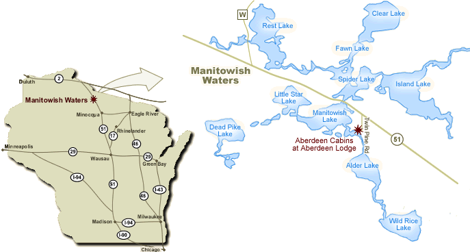 If traveling North from Hwy 8, take Hwy 51 twenty miles past the Minocqua bridge and turn left at Twin Pines Road. Take 1/2 mile to Aberdeen Lane and turn right.